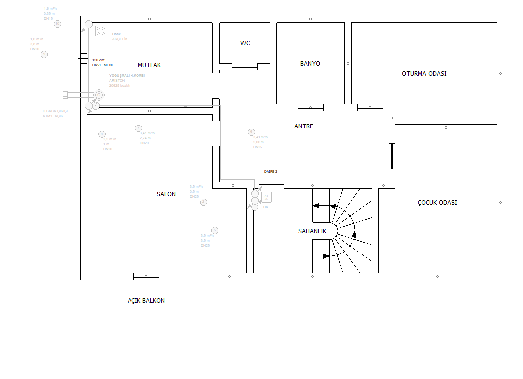 Tesisat planı üzerinde çalışmak için bu modda bulunmalısınız. Tesisat planı modunda mimariye ait gösterimler silik gri ile çizilerek, tesisat planında daha rahat çalışma sağlanır.