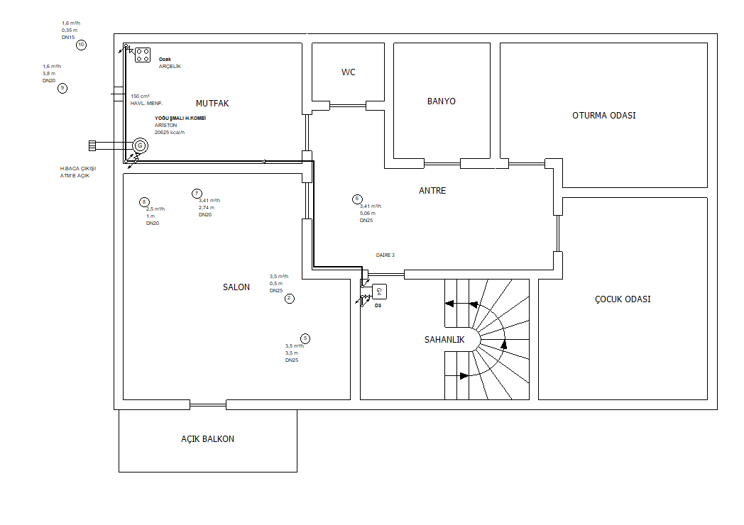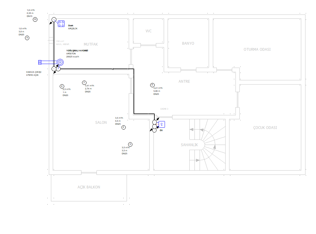 Tesisat planı modunda, hat çizebilirsiniz, mevcut hatları ve tesisat elemanlarını silebilirsiniz, tesisata ait her şeyin özelliklerini tanımlayabilirsiniz.