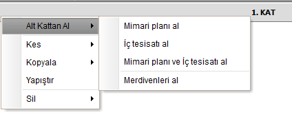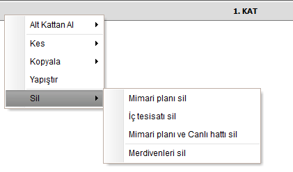 Ayrıca kat geçiş çubuğuna sap tıklayarak ilgili katların mimari ve tesisat planlarını kopyalama - yapıştırma - silme gibi işlemlerini ilgili kata gitmeden yapabilirsiniz.