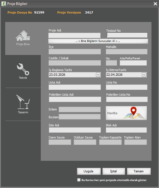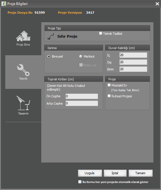 Proje tipinde, projenin sıfır proje, veya sadece iç tesisat olup olmadığını belirtiniz. Eğer proje bunlardan birinin teknik tadilatı ise teknik tadilat seçeneğini seçiniz.