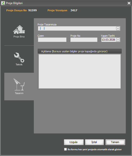 - Proje No için ayrılan yer, firmanız içinde projelenize verdiğiniz arşiv numarası içindir. Buraya girilen no aynı zamanda kapakta da yer alır.
