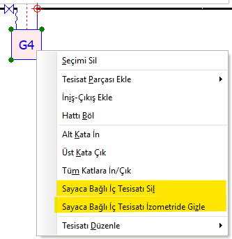 | Sayaca Bağlı İç Tesisatı İzometride Gizle | Bazı iç tesisatlar birbirinin aynı olduğu için izometride bunların hepsini gösterip karışık bir görüntü sunmak yerine, bunlardan yalnızca birini gösterip diğerlerini gizleyebiliriz. Gizlenmiş olan bir iç tesisatı göstermek istersek yine sayaca sağ tıklayıp "Sayaca Bağlı İç Tesisatı İzometride Göster" dememiz gerekir. |