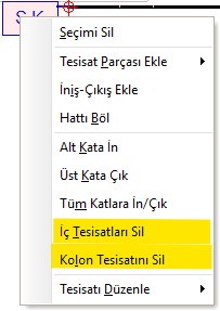 | İç tesisatları Sil | Tüm iç tesisatları siler ve kolonu yalnız bırakır. Sadece kolon tadilat projeleri için kullanılabilir. |