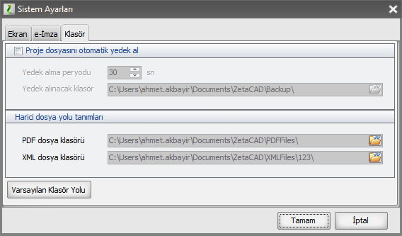 Klasör sekmesinden - projenin yedek alıp almaması, - ne kadar bir zamanda yedek alacağı, - hangi klasöre yedekleyeceği, - İmzalı proje PDF'i ya da Gazmer cihaz listelerinin hangi klasörde depolanacağını