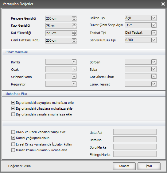 Varsayılan değerler panelinden yaptığınız seçimler, projede başka bir seçim yapamayacağınız anlamına gelmez. Buradaki seçimleri isterseniz projede değiştirebilirsiniz. Örneğin Varsayılan tesisat Tipi Esnek olsun dediğinizde, projeye bir sayaç eklediğinizde esnek tesisat işaretli gelir. isterseniz projede esnek tesisat işaretini kaldırıp dişli ya da kaynaklı seçebilirsiniz. Varsayılan değerler paneli sürekli seçim yaptığınız konularda seçimlerinizi azaltarak işlerinizi hızlandırma amaçlıdır.