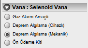 Deprem Algılama (cihazlı): Selenoid vana deprem algılama cihazına bağlı olarak bir deprem anında cihazdan aldığı sinyalle gazı kesmek üzere konulmuşsa bu seçenek işaretlenmelidir.