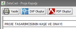 Projenin sadece bir usnurunu basmak veya PDF, DXF oluşturmak için ilgili yerdeki Yazdır ve DXF Oluştur butonlarına tıklayınız. Vaziyet planı, proje kapağı, hesap formları, izometrik şema gibi pencereler açıkken size o pencerenin içeriğini basmak veya PDF, DXF formatına dönüştürmek için butonlar sunar. Bu butonlar aracılığıyla kısmi baskıyı gerçekleştirebilirsiniz. Bununla beraber, proje ortamında sadece aktif katı basmak için araç çubuğunda bulunan Yazdır, PDF, DXF Oluştur butonlarını kullanınız.