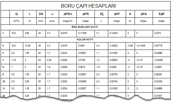 Boru çapı değerlerini gösteren aşağıdaki hesap tablosuna ulaşmak için Hesap menüsünden Boru çapı hesapları seçeneğini tıklayın. Ortaya çıkan tabloda, o andaki tesisat tasarımında otomatik oluşan tüm değerler kullanılarak hesaplanan boru çapı hesap değerleri gösterilir. Aynı tabloya araç çubuğu üzerindeki şu butona tıklayarak da girebilirsiniz.
