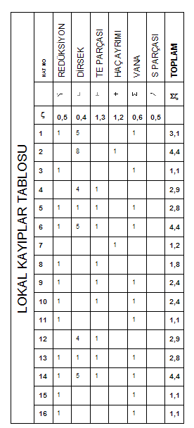 Lokal kayıpları gösteren hesap tablosuna ulaşmak için Hesap menüsünden Lokal Kayıplar seçeneğini tıklayın. Ortaya çıkan tabloda, o andaki tesisat tasarımında otomatik oluşan tesisat parçalarından hesaplanan lokal kayıp değerleri gösterilir. Aynı tabloya şu butona tıklayarak da girebilirsiniz.