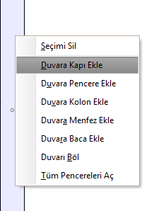 Bir duvara kapı(veya pencere) eklemek için, duvar (veya pencere) özellikleri panelini, ekle mensünü veya sağ tuş menüsünü kullanabilirsiniz. En hızlı yol sağ tuş menüsünü kullanmaktır.