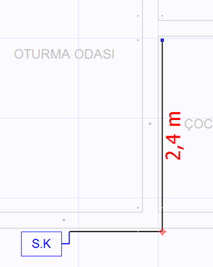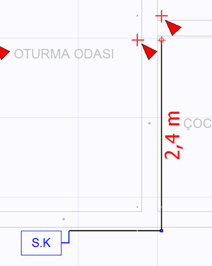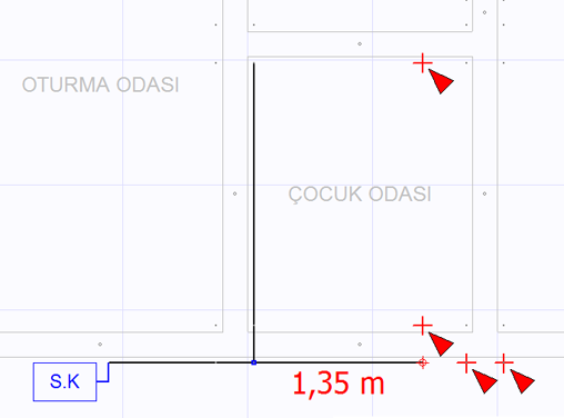 Yukarıdaki örnekte, önce kutudan sağa doğru bir dayama noktasına gidilmiş ve sonra düzlemde yukarı hareketiyle tesisat 90 derecelik açıyla oturma odasının köşesine dayanmıştır. Daha sonra ise fare ile ilk köşeye tıklanarak kalem buraya alınmıştır. Şimdi kavyeden gelen çizim komutu bu noktaya uygulanacaktır. Nitekim aşağıdaki resimde bu noktadan tekrar sağa doğru çizilmiş hat gözükmektedir.